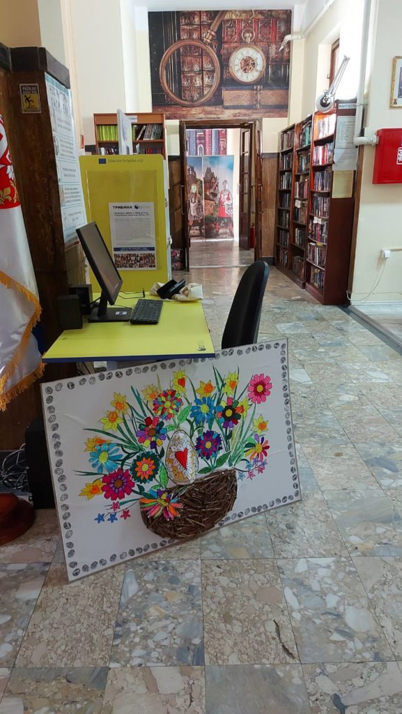 Дешавања УСКРШЊА РАДИОНИЦА 21. априла 2022. Dragana Одржана је Ускршња радионица на Дечјем одељењу Народне библиотеке ,,Илија М. Петровић“ Пожаревац, 20. априла 2022. године. Учесници су били ђаци 1. разреда ОШ ,,Доситеј Обрадовић“.