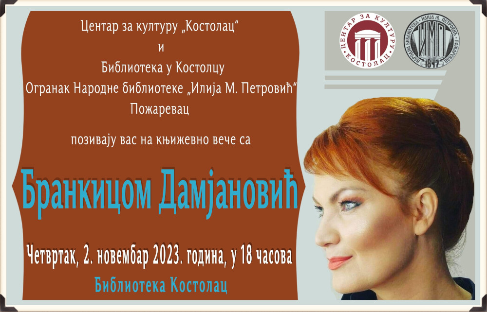 Библиотека у Костолцу, Огранак Народна библиотеке „Илија М. Петровић“ Пожаревац и Центар за културу „Костолац“ позивају вас на књижевно вече са Бранкицом Дамјановић.