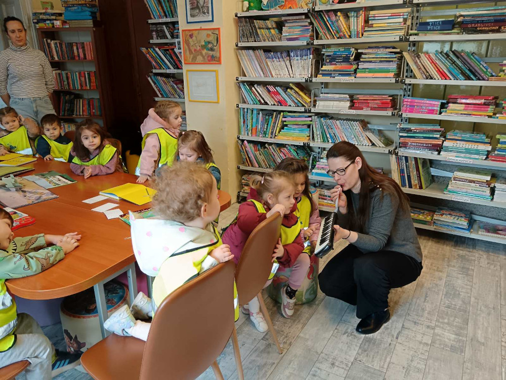 Најмлађи и најслађи другари из Blue bunny вртића доскакутали су право у нашу библиотеку уз пуно смеха и дечје граје, 2. марта 2026. године. Ови малци се у оквиру теме у свом вртићу упознају са различитим звуковима! Те су тако ,,ЗВУЦИ“ били тема данашње радионице. Радионицу је водила библиотекарка Маја Маринковић Павловић. Најпре смо се упознали са правилима понашања у библиотеци, а онда смо прешли на све оне звуке који их окружују у свакодневном животу. Неко се присетио звука звонца на вратима, неко музике, неко вике… Пажњу су им украле наше звучне књиге којима су кроз игру повезивали звук и слику! Играли смо игрицу препознај домаћу животињу у којој су били јако добри. Затим смо сви заједно опонашали хук сове, завијање вука, шуштање лишћа, шум ветра… Малишани су приметили да су неки звуци у природи тиши, док су неки гласнији. Од једне девојчице смо сазнали да јој тата свира бубњеве, па је то био одличан увод у причу о инструментима. Књиге из едиције ,,Пеца свира“ … биле су сјајан додатак разговору о музици, а потом су клинци и клинцезе сами свирали на необичној калимби и усној хармоници. Иако изузетно мали, показали су да вешто опажају свет око себе, уочавају промене и емитовно доживљавају свет животиња и музике. За сам крај дружења смо сви заједно отпевали ,,Кад си срећан лупи тада длан о длан“ и у распеваној атмосфери смо закључили данашњу причу о звуцима.