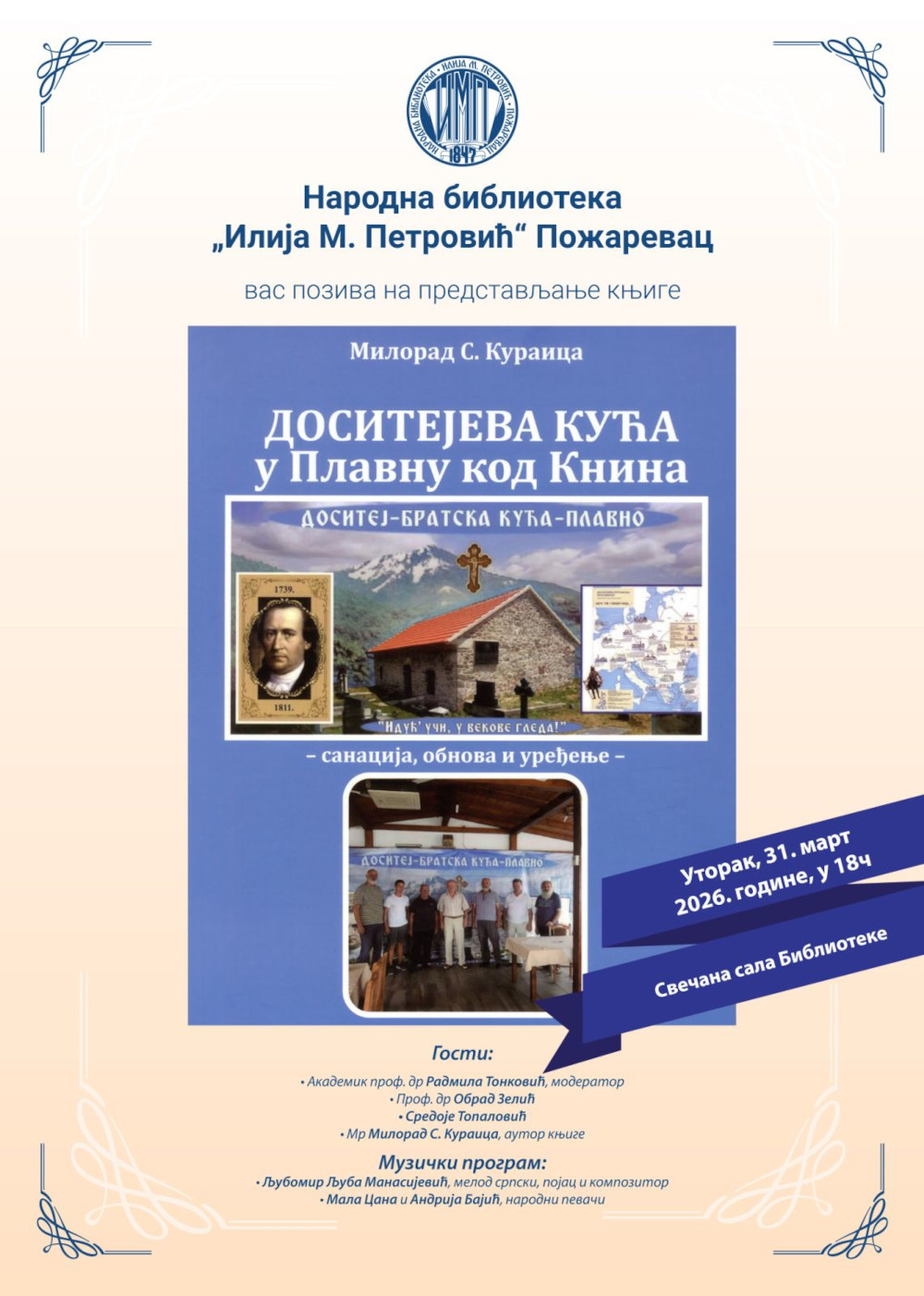 Најаве ПРЕДСТАВЉАЊЕ КЊИГЕ ,,ДОСИТЕЈЕВА КУЋА У ПЛАВНУ КОД КНИНА“ 20. марта 2026.23. марта 2026. Dragana